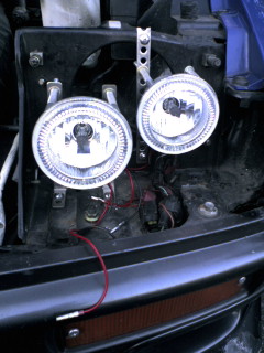 市販のホワイトバックフォグを流用、バンパーに加工取り付けをします。ハイワットハロゲンバルブになるのでリレーユニットも付けましょう。