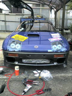 バイク用のウインカーを流用、バンパーに加工取り付けをします。ハーネス加工も忘れずに。