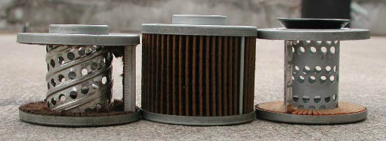 フィルター本体自体の比較。中央がモノタロウフィルター。左が旧型フィルター、右が純正だ。高さは純正よりも高くなっている。これ以上分解していないが、濾紙の長さ自体は旧型フィルターと同じではないかと思われる。