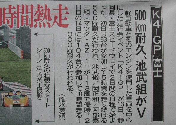 500km耐久の詳細は、P岡さんのブログ(代表例)を参照のこと。ここでは、総合優勝した際に掲載された、東京中日スポーツの記事を抜粋・転載する。