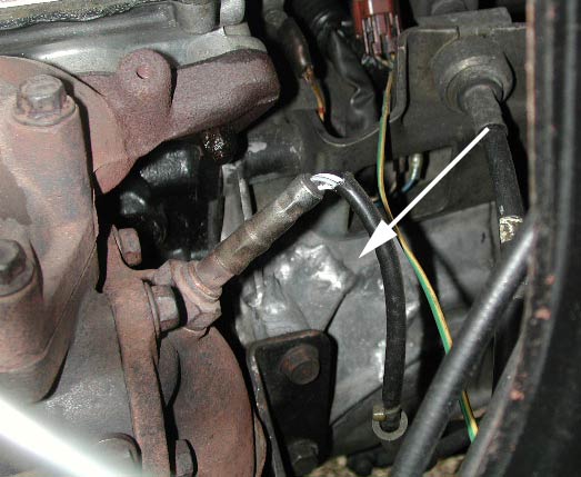 矢印部分が溶接したところ。エンジン共々無事に車に乗った。