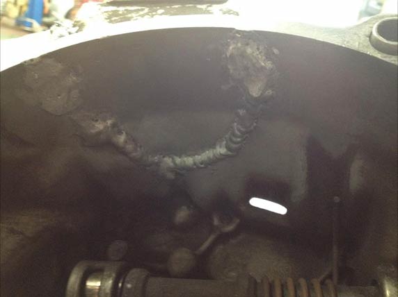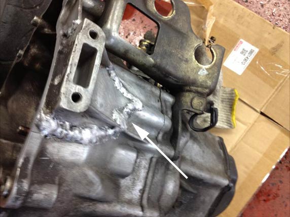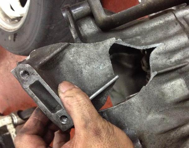 ぱっくり割れたケース。車両前方のエンジンマウントがつく部分だ。きれいに割れたため、欠損した部分がなかったのが幸いした。