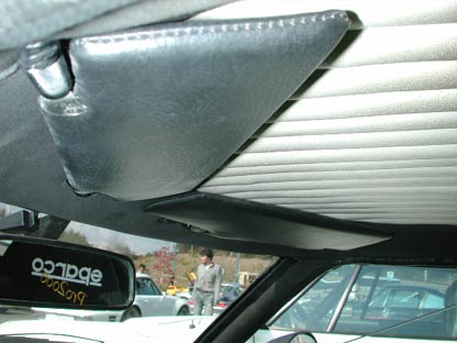 天井部分。トップシーリングは段付きになっている。かなり珍しい形状だと思う。さらに特徴的なのはサンバイザー。大きく湾曲したフロントガラスの影響で、キャビン中央からみるとV字型についていることがわかる。