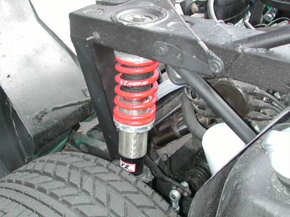 サスの拡大写真。さすがに車高調だけは調整しやすそう。タイヤをはずさなくてもなんとかなりそうだ。