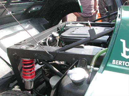 エンジンルームをみてみよう。太く巨大な箱形フレームの中にエンジンが、箱の「辺」の部分にサスが取り付けられている。エンジンは下から抜くのだろうか。