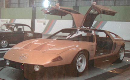 ベンツC111。300SLを思い起こさせるダンパーの取り付け位置とガルウイングの上がり方だ。吊革まである。