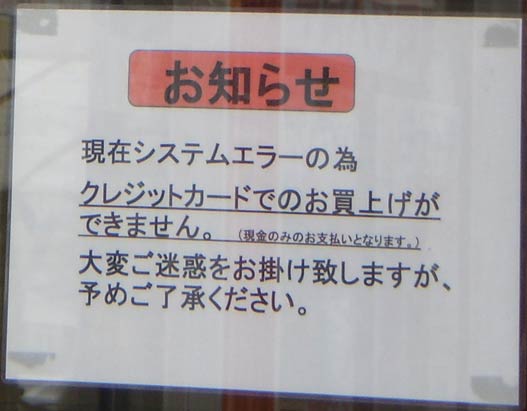 システムダウンの影響はこんな所にも現れていた。クレジットカードが使えない・・・すごい店である。