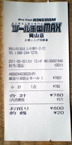 買ったのはこれ、静音計画。AZ−1のドアモールの代替品である。これはツール王国MAXで取り扱っていなかったものなので、店が独自に手配したものだ。