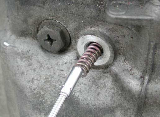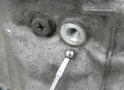 ミッションケース本体にある、矢印のネジ(キャップ)をはずす。同様のキャップは計3カ所ある。