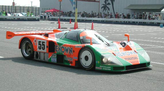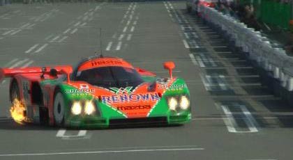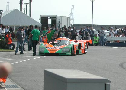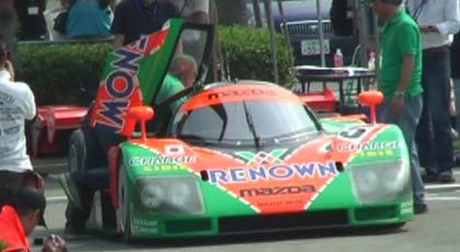 走行中の787B。100w×4灯のヘッドライトは真昼でもまぶしい。ルマンの夜間走行では、これで問題ないそうだ。最近はHIDでもっと見やすくなっているとのこと。