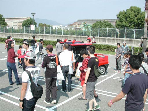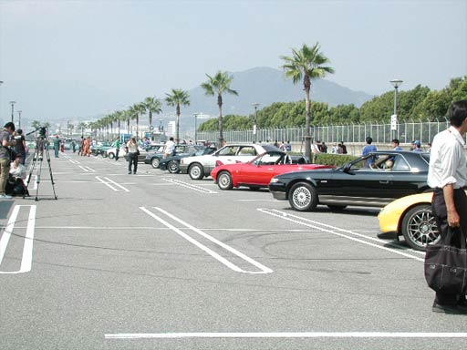 1台づつ発進して場内をゆっくり走行でパレード。会場を合計3周ほどした後に上の写真のように整列した。運転席側のガルウイングを開け、手を振りながら走行したら、みんな手を振りかえしてくれた。他の車はそんなことしなかったみたいなので、やはりAZ-1は結構目立ったかなあ。