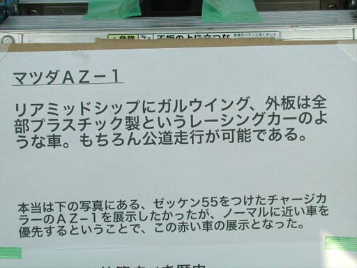 車の横に置いてあるのは、いつもの説明書き。チャージカラーのAZ-1が展示できなかったことに対するせめてもの反抗。そしてAZ-1の正当性を示すものだ。