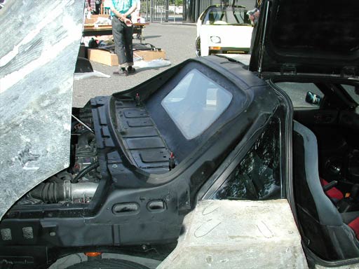 リアのガラスは、写真のように取り付けられていた。もともとリアガラスより内側にある鉄板が、外板となっている。