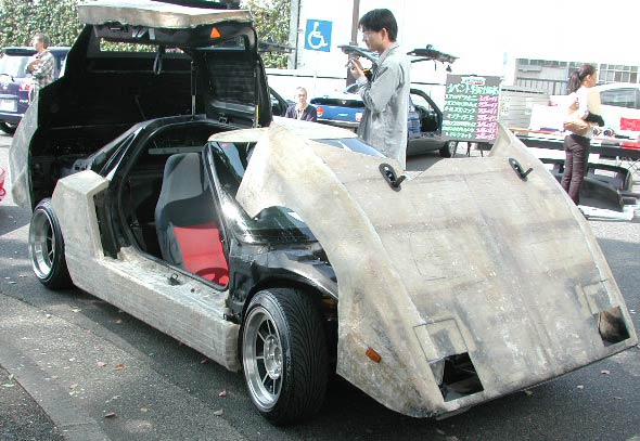 エンジンフードをあけたところ。ノーマルのAZ−1と比較すると、タイヤが大きく外へはみ出している。その長さ、タイヤ一本分。フロントはそこまではみ出していない。