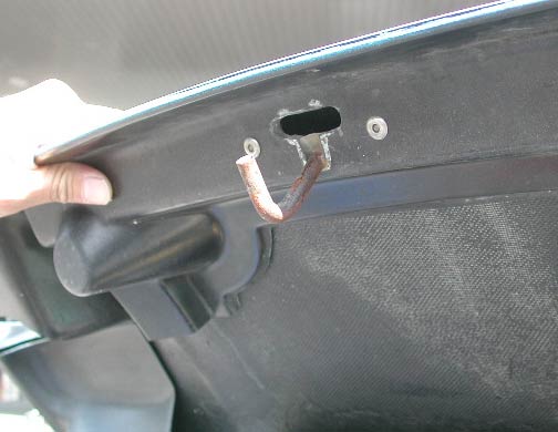 このボンネットに関し、地味ながらも個人的に最も興味があったのが、ボンネットフックである。ノーマルのボンネットについているボンネットフックの直径と同じ大きさの鉄線は、入手困難と聞いていたからだ。見せてもらうと、写真のようなものが付いていた。