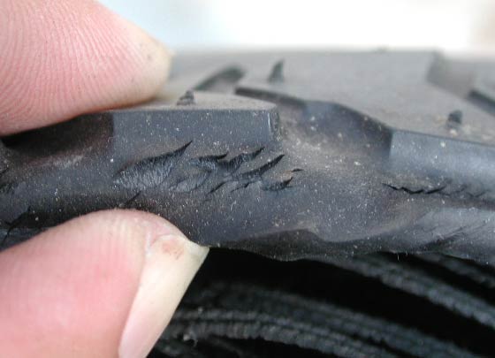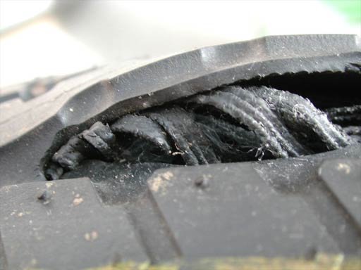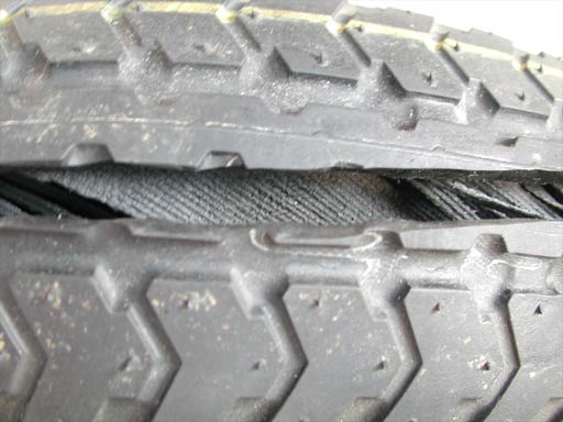 トレッド面のゴムをめくってみると、カーカス(タイヤの中に入っている線)が見える。カーカスが斜めになっているので、ラジアルタイヤではなくバイアスタイヤだ。