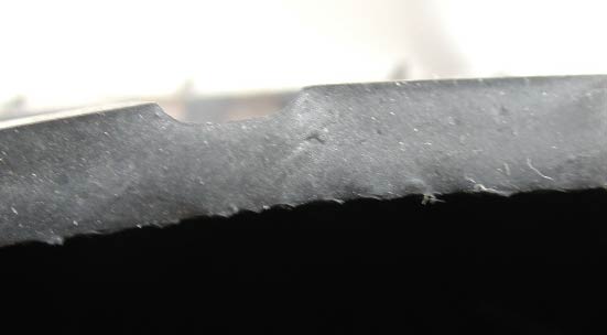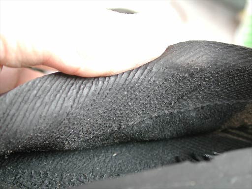 トレッド面のゴムをめくったところ。表面にはカーカスの跡が見える。めくることができるのはここまでで、ここから先はカーカスとゴムが強固にくっついていてダメだった。