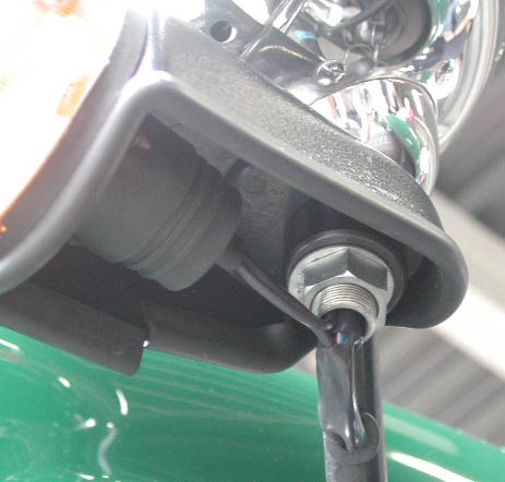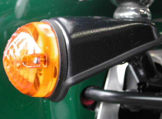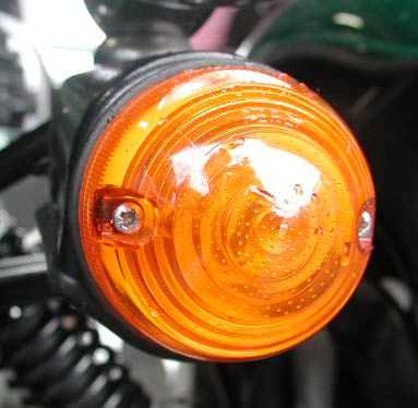 ヘッドライトは以前紹介した通り5.25インチの物が付いている。では、ウインカーなどはどうだろうか。フロントのウインカーは、旧MINIに使われているものと同じレンズが使われていた。英国車御用達のレンズである。