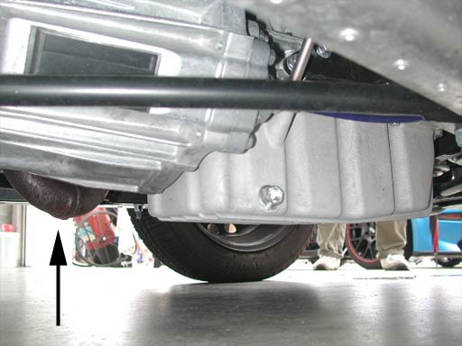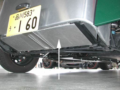 右からフロア下を見たところ。写真右に見える四角形の箱はオイルパン。K6A純正のオイルパンだと最低地上高がクリアできない。かといって、ドライサンプにしたら高くなるし、そうしたところで、矢印で示す排気管が最低地上高クリアのためのネックとなるので、ドライサンプ自体に意味がない。